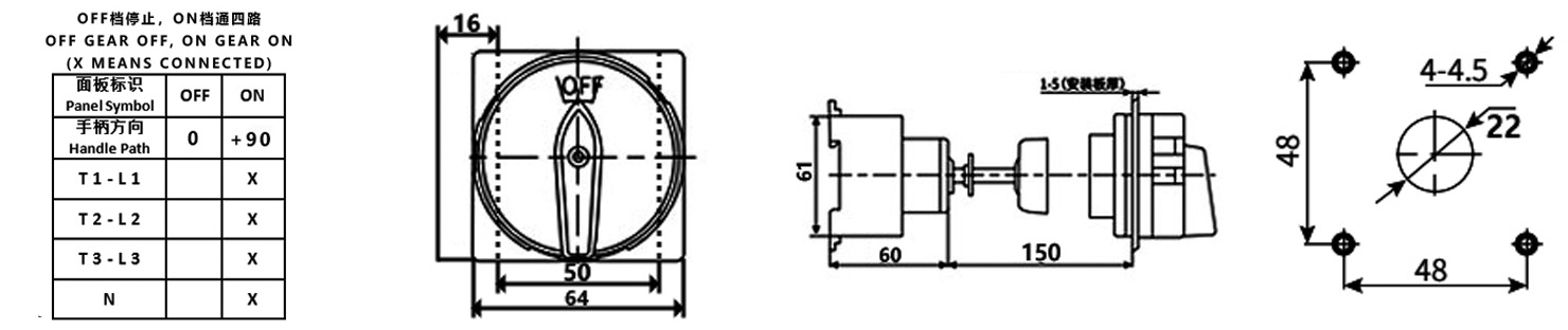 Способ установки: Основание корпуса переключателя устанавливается внутри шкафа и соединяется с рабочей ручкой снаружи дверцы шкафа посредством жесткого длинного стержня, обеспечивающего внешнее управление. Такая конструкция обеспечивает защиту корпуса выключателя, облегчает эксплуатацию и исключает необходимость в больших отверстиях в панели.