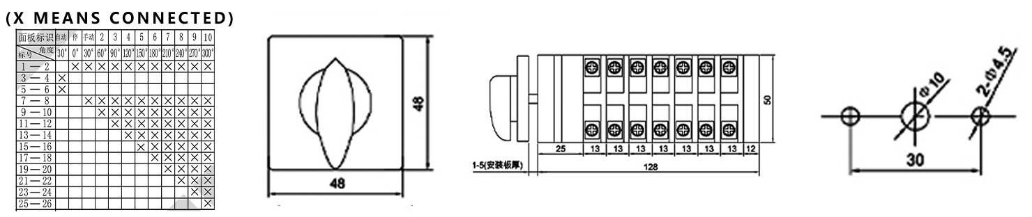 Положение регулировки «вручную» (по часовой стрелке от 30° до 300°): поверните черную ручку; указатель перемещается по циферблату от «1» до «10». Согласно схеме электропроводки (X означает «включено»), на каждом этапе добавляется новый набор соответствующих контактных цепей, таким образом последовательно подключая один конденсатор, пока не будут подключены все десять цепей.
