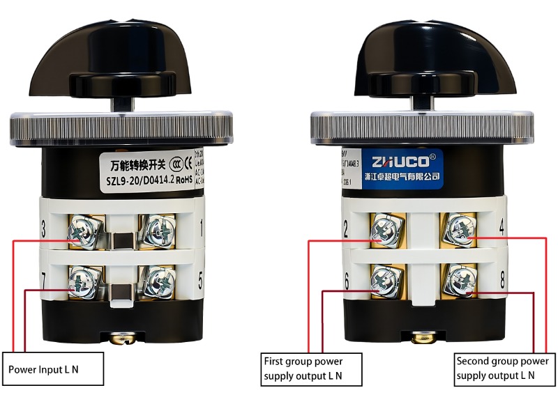 Функция: Разделяет один вход питания на два выхода питания для переключения между двумя устройствами. При повороте ручки в положение 1 включается первая цепь LN; в положении 2 включается вторая цепь LN; в центральном положении O все цепи обесточиваются.
