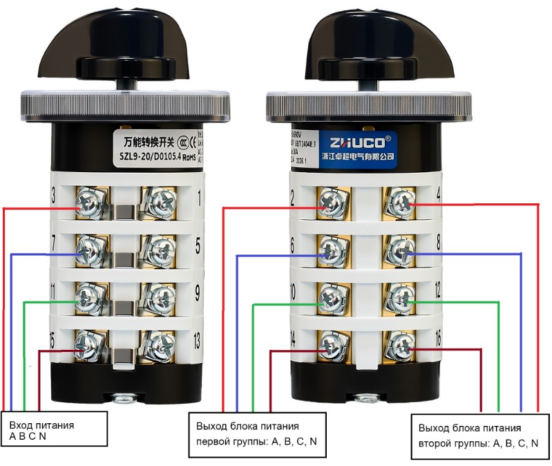 Функция: Разделяет один вход питания на два выхода питания для переключения между двумя устройствами. При повороте ручки в положение 1 включается первая группа ABCN; в положении 2 включается вторая группа ABCN; в центральном положении 0 все соединения обесточиваются.
