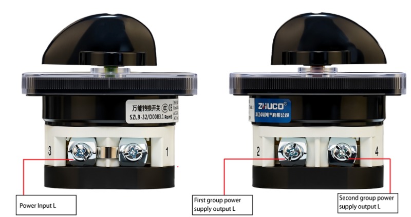 Функция: Разделяет один вход питания на два выхода питания для переключения между двумя устройствами. При повороте ручки в положение 1 первая группа L находится под напряжением; в положении 2 вторая группа L находится под напряжением; в центральном положении 0 все соединения обесточены.