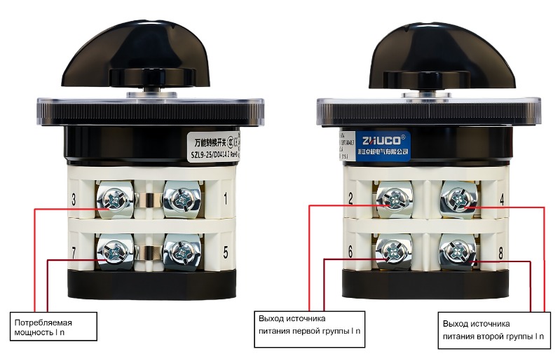 Функция: Разделяет один вход питания на два выхода питания для переключения между двумя устройствами. При повороте ручки в положение 1 включается первая цепь LN; в положении 2 включается вторая цепь LN; в центральном положении 0 все цепи обесточиваются.
