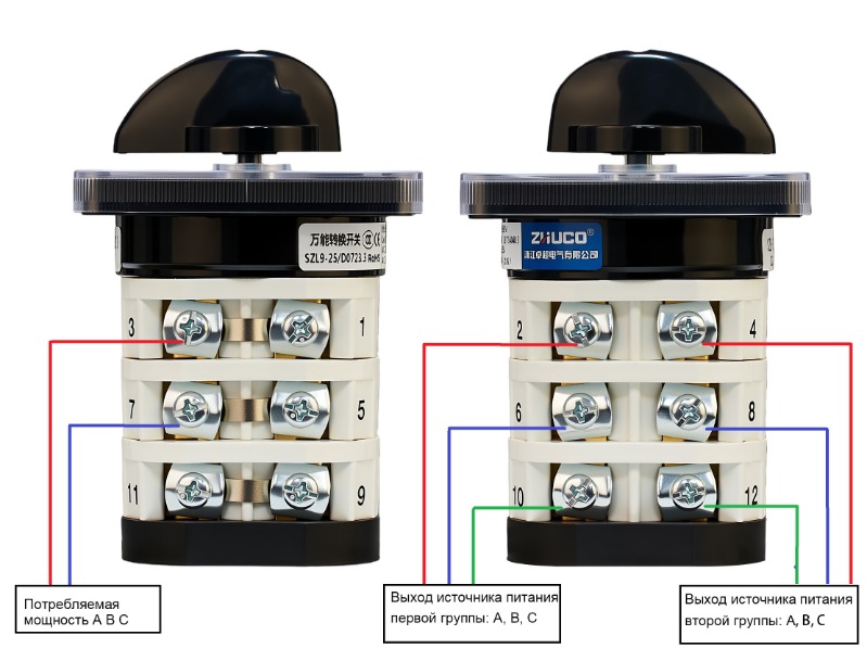 Функция: Разделяет один вход питания на два выхода питания для переключения между двумя устройствами. При повороте ручки в положение 1 включается первая группа ABC; в положении 2 включается вторая группа ABC; в центральном положении 0 все соединения обесточиваются.