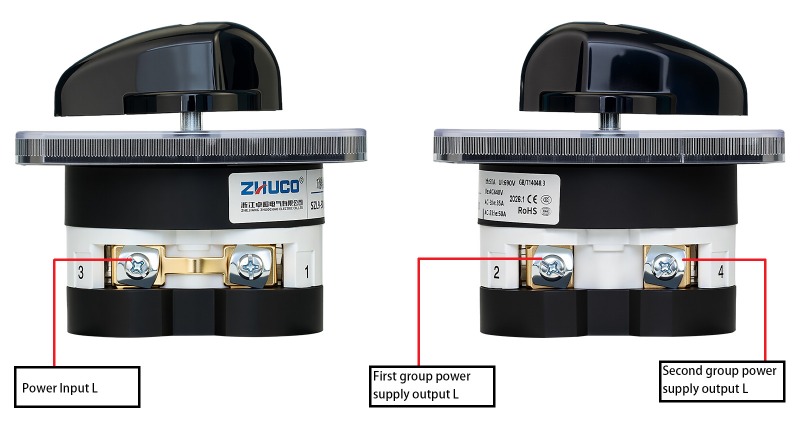 Функция: Разделяет один вход питания на два выхода питания для переключения между двумя устройствами. При повороте ручки в положение 1 первая группа L находится под напряжением; в положении 2 вторая группа L находится под напряжением; в центральном положении 0 все соединения обесточены.