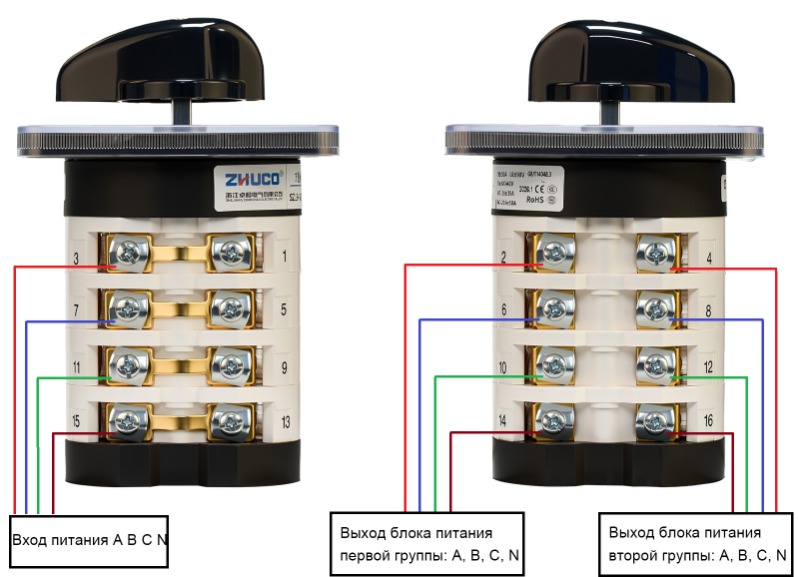 Функция: Разделяет один вход питания на два выхода питания для переключения между двумя устройствами. При повороте ручки в положение 1 включается первая группа ABCN; в положении 2 включается вторая группа ABCN; в центральном положении 0 все соединения обесточиваются.