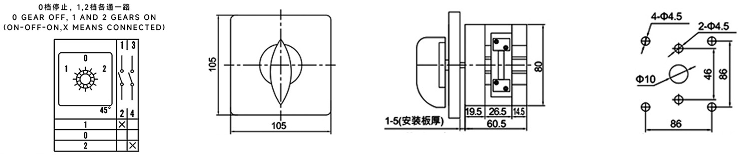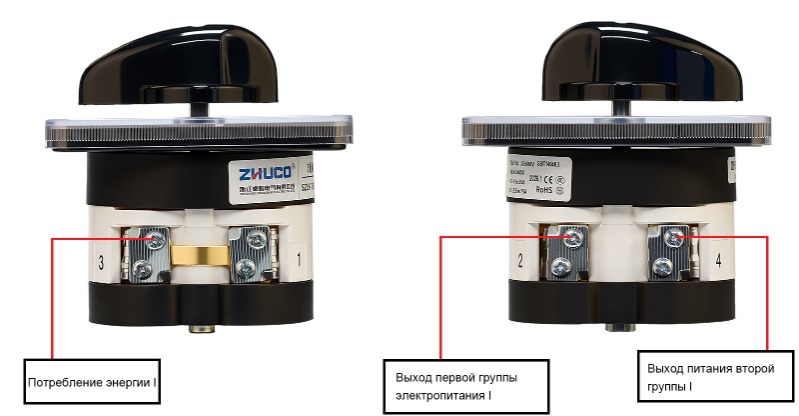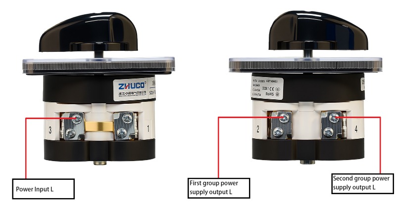 Функция: Разделяет один вход питания на два выхода питания для переключения между двумя устройствами. При повороте ручки в положение 1 первая группа L находится под напряжением; в положении 2 вторая группа L находится под напряжением; в центральном положении 0 все соединения обесточены.