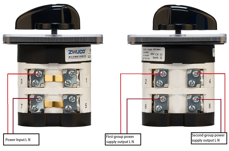 Функция: Разделяет один вход питания на два выхода питания для переключения между двумя устройствами. При повороте ручки в положение 1 включается первая цепь LN; в положении 2 включается вторая цепь LN; в центральном положении 0 все цепи обесточиваются.
