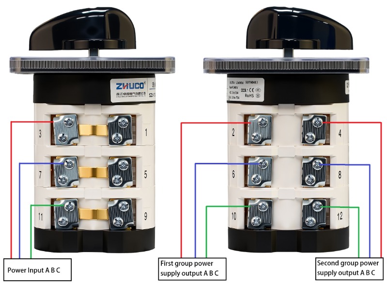 Функция: Разделяет один вход питания на два выхода питания для переключения между двумя устройствами. При повороте ручки в положение 1 включается первый набор соединений ABC; в положении 2 включается второй набор соединений ABC; в центральном положении 0 все соединения обесточиваются.
