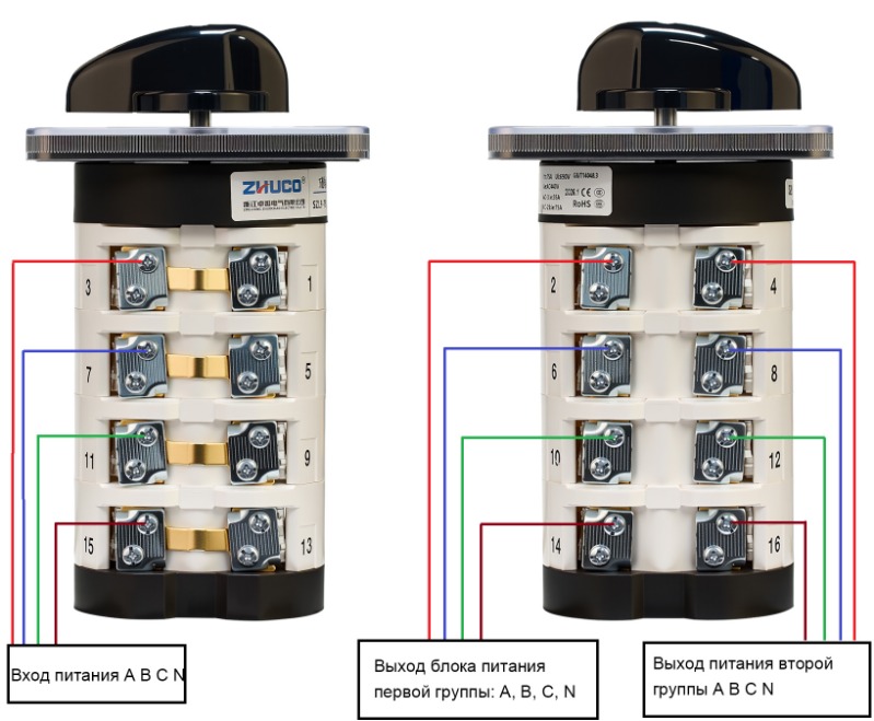 Функция: Разделяет один вход питания на два выхода питания для переключения между двумя устройствами. При повороте ручки в положение 1 включается первая группа ABCN; в положении 2 включается вторая группа ABCN; в центральном положении O все соединения обесточиваются.